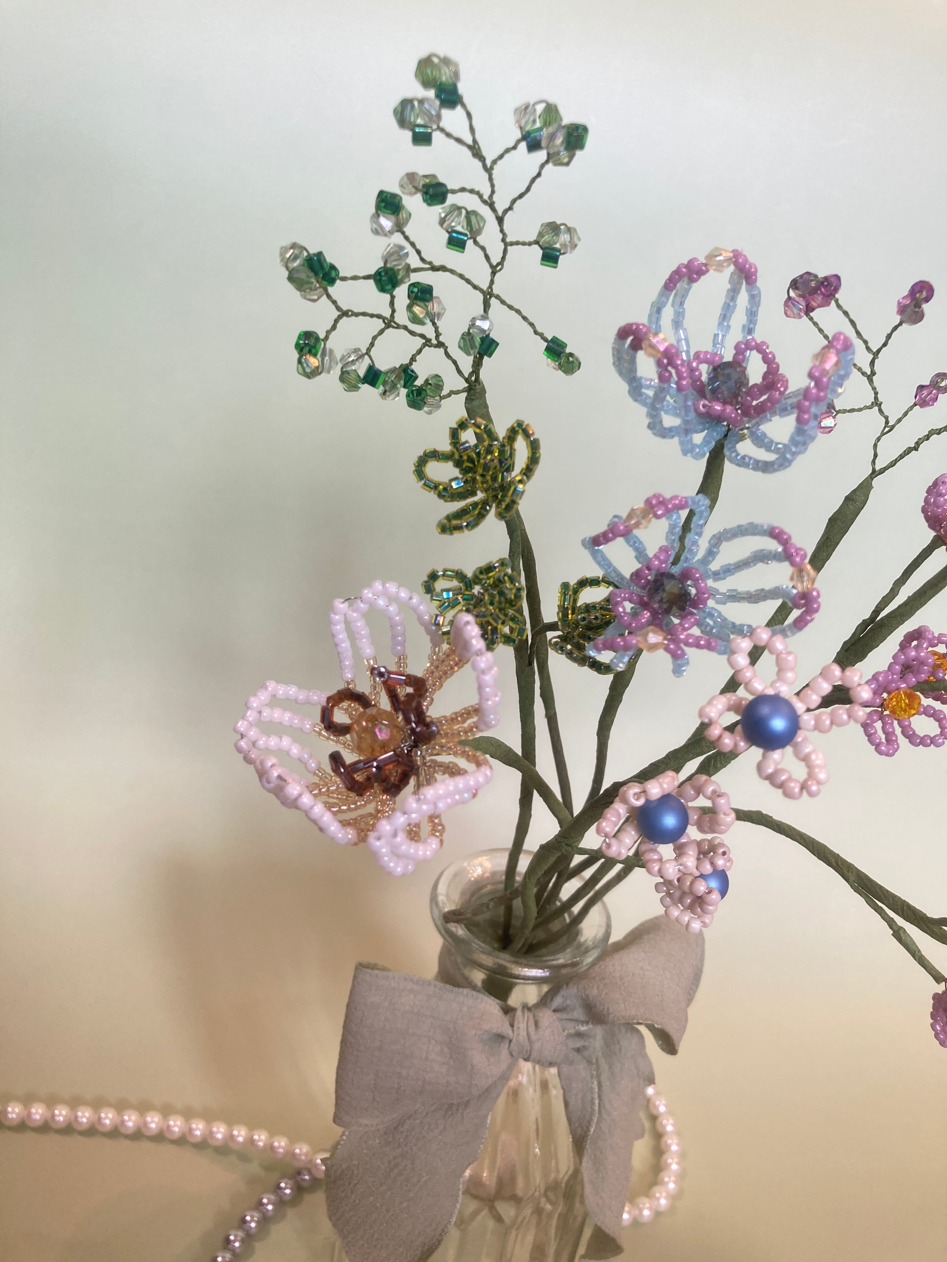 一つ一つ手作業で制作しているため、形やサイズに若干の個体差がございます。また、ビーズの色味や配置が写真と異なる場合がございます。ハンドメイドならではの風合いとしてご理解ください。